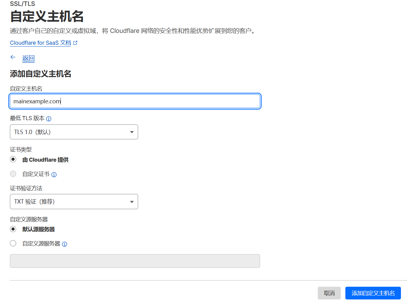 然后再到SSL/TLS – 自定义主机名,添加回退源,域名就填写上面的辅助域名的回源域名