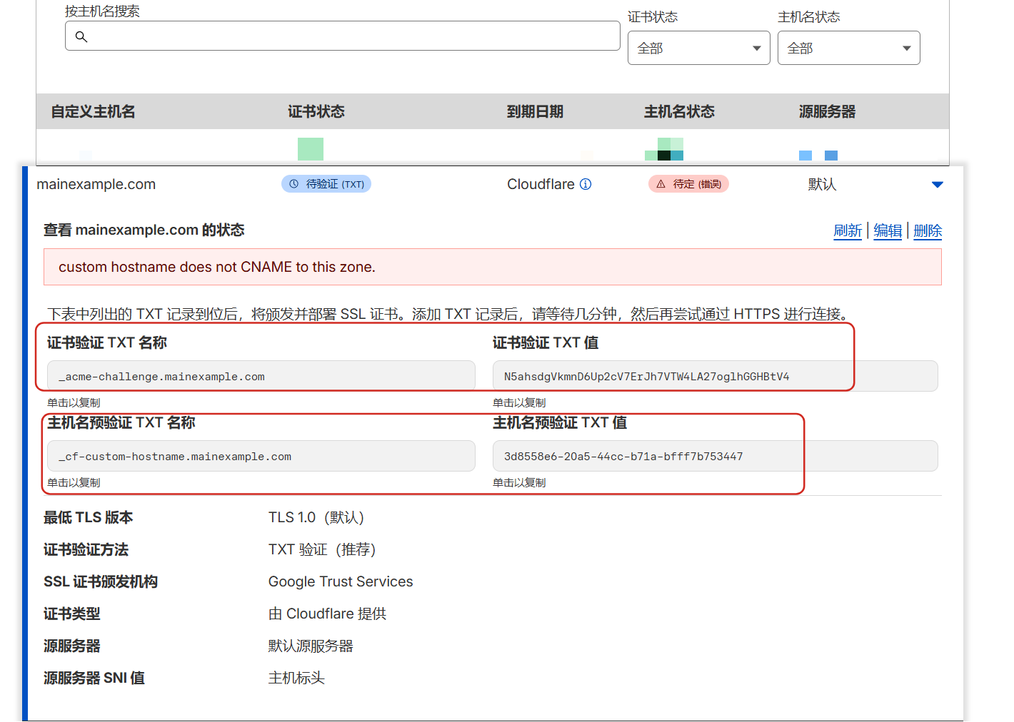 4条解析都登记完成后,可以看到cf的自定义主机名状态刷新变成2个有效就成功了