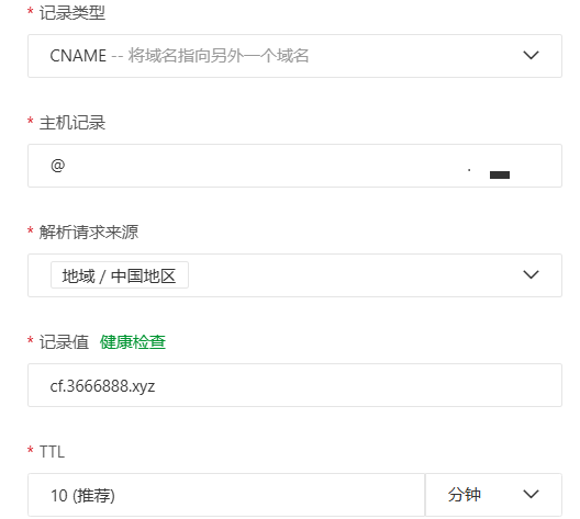 - 主域的国内解析cname到优选ip域名,这里推荐有(saas.sin.fan、wto.com、cf.3666888.xyz)